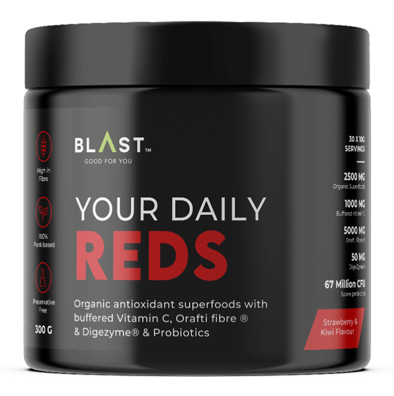 BLAST™ Daily Reds is packed with organic antioxidant superfoods that shield your cells from free radical damage. When your body struggles to eliminate free radicals efficiently, it leads to oxidative stress, adversely affecting cells and bodily functions. With a potent dose of beetroot, this formula enhances circulation, heart health, exercise endurance, reduces recovery time, and boosts brain function.